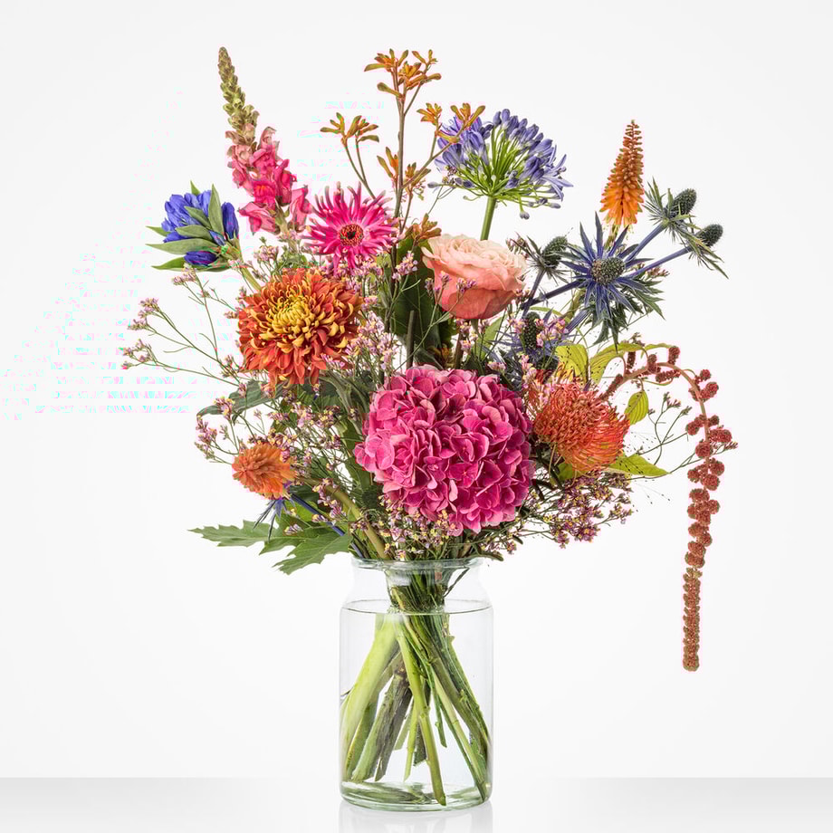 Royaal, kleurrijk en hét boeket om mee uit te pakken. Boeket Uitzinnig najaar heeft het allemaal. Dit exclusieve en rijkgevulde boeket bevat de mooiste en meest opvallende bloemen van dit seizoen. Uitbundig en uitzinnig en het perfecte cadeau. Voor jezelf of iemand anders.